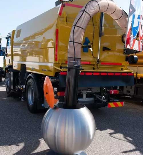 該系統(tǒng)配有專(zhuān)用工作車(chē)輛,在車(chē)身背后配掛一根超長(zhǎng)的管子,掀開(kāi)泡泡垃圾桶的蓋子,司機(jī)取下管子,把管子從上方放入圓球,利用產(chǎn)生高效的空氣旋渦,就像一臺(tái)強(qiáng)勁的吸塵器快速把垃圾集速吸走。這樣一來(lái),既減少了管理上的人工、物耗,又不會(huì)造成路面多余的污漬痕跡。