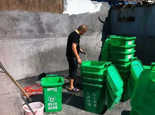 前天上午8點,金棉小區(qū)廢棄籃球場的東南角就響起了一陣陣沖洗聲,清潔人員劉師傅拿著水管沖洗著一只只垃圾桶,邊上一排晾著幾十只剛洗干凈的垃圾桶。這些垃圾桶都是早上從小區(qū)里收集來的,洗干凈晾干后,第二天去替換其他臟的垃圾桶。
